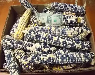 I harvested some of my ornamental corn. This is mostly a cross between Silver Mine and Santo Domingo Blue. I planted five rows. This is one row's worth of ears. As you can see, it fills a 40 pound banana box to overflowing.