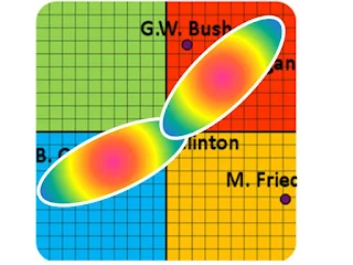 The conventional wisdom suggests that there would be a mountain range angling diagonally across the screen from the lower-left to the upper-right. Further, conventional wisdom suggests that there would be a "saddle" in the middle of the mountain range with "peaks"near both ends. One peak might be somewhere between Obama and Clinton with the other peak between Bush and Reagan.