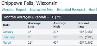 | Record low for Chippewa Falls, Wisconsin is -45 F. |