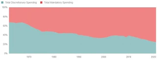 | Mandatory vs Discretionary spending. Mandatory is ocher colored (red) while Discretionary is aqua (blue-green) |