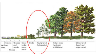 | The clump of trees in the middle of the photo are Wild Black Cherries (P. serotina). Like grape vines, it is also an early pioneer, woody species. The seeds may have been planted by the very same bird. You can see a multi-stemmed cherry that died circled in red. |