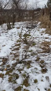 | The mess does not photograph well because of the patchy, melting snow. I am pulling quite a bit of wood out of the orchard. |
